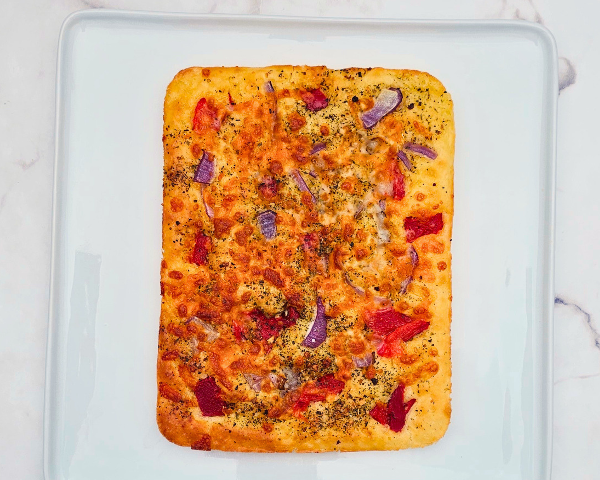 - The Toppings: Red onion, tomato, ball pepper, vegan cheese, and savory tomato sauce.